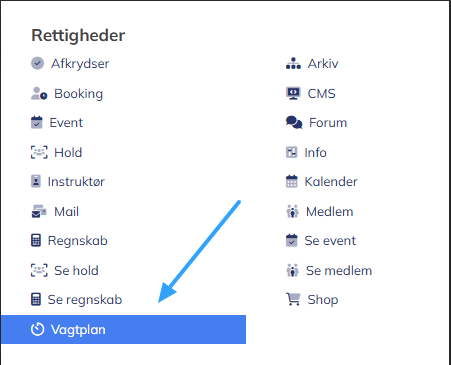 OBS. For at kunne tilgå og arbejde med al vagtplan relaterede funktioner skal man først have rettigheden Vagtplan.
